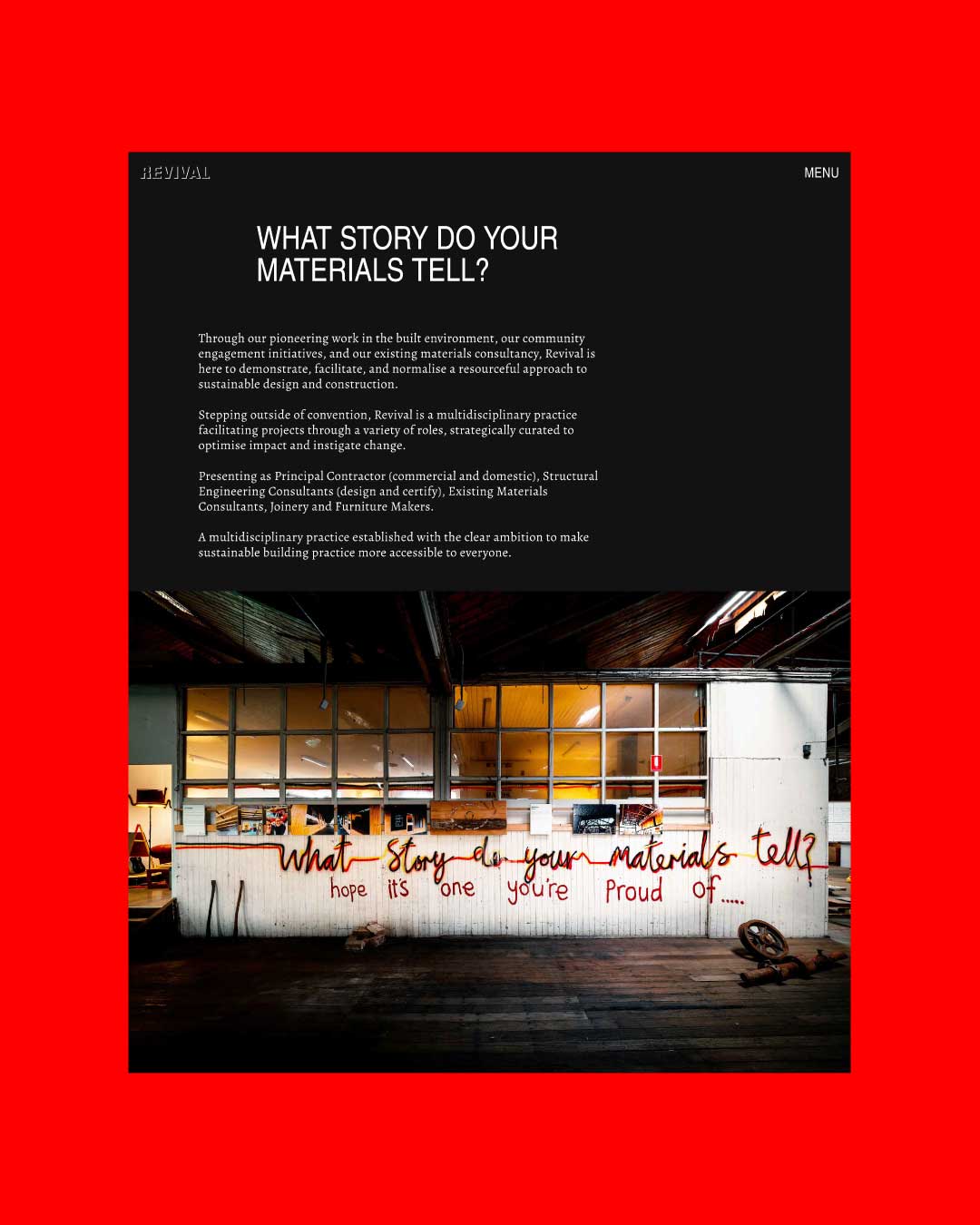 Revival is an award-winning building and design practice transforming construction waste destined for landfill into reusable materials. As the company began disrupting its sector, it needed to clearly communicate its mission and environmental impact beyond traditional industry design and messaging.
